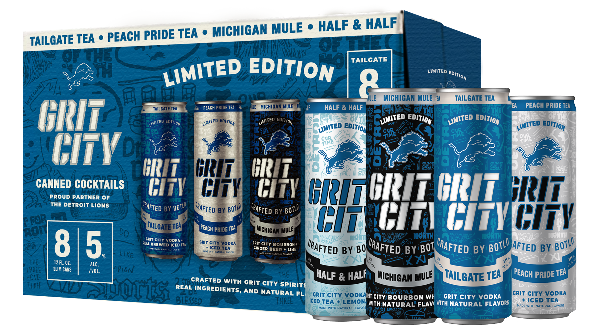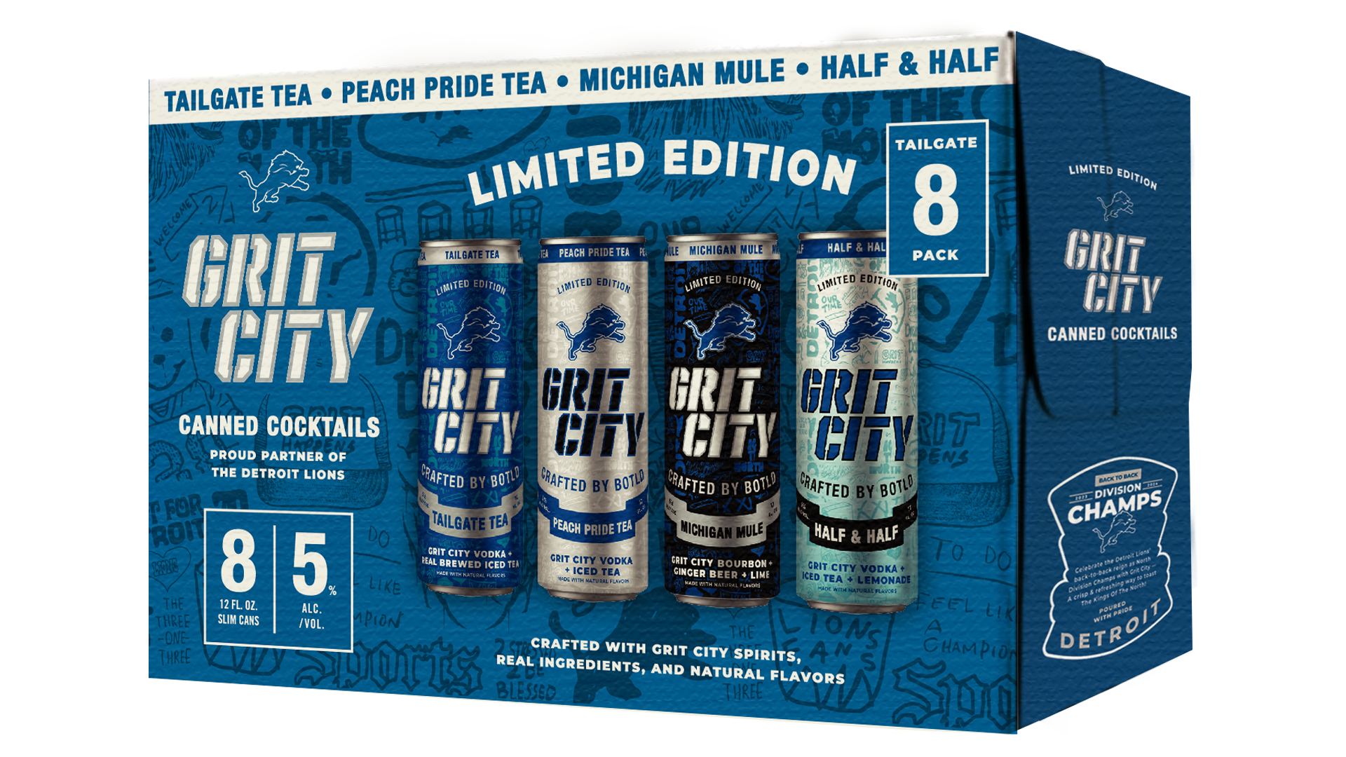Defend The Den with this limited-edition Grit City Variety Pack — the ultimate ready-to-drink lineup for Lions fans. Each 8-pack features four tailgate-ready flavors: Tailgate Tea, Half & Half, Michigan Mule, and Peach Pride Tea. Created in honor of the Detroit Lions’ 90th anniversary of their 1935 World Championship, these made-in-Michigan cocktails are crafted with Grit City Spirits and built for game day from the first whistle to the final snap.